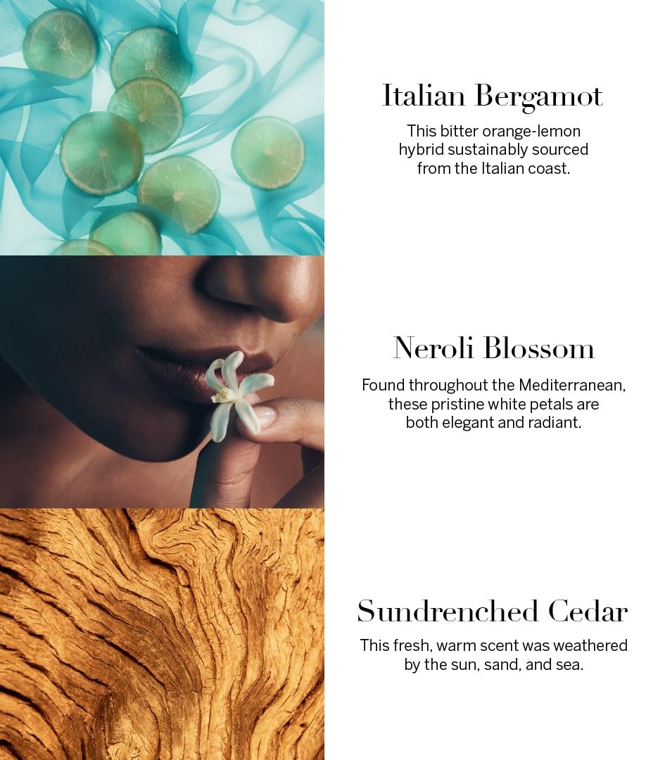- Scent notes of italian bergamot, neroli blossom, and sundrenched cedar.