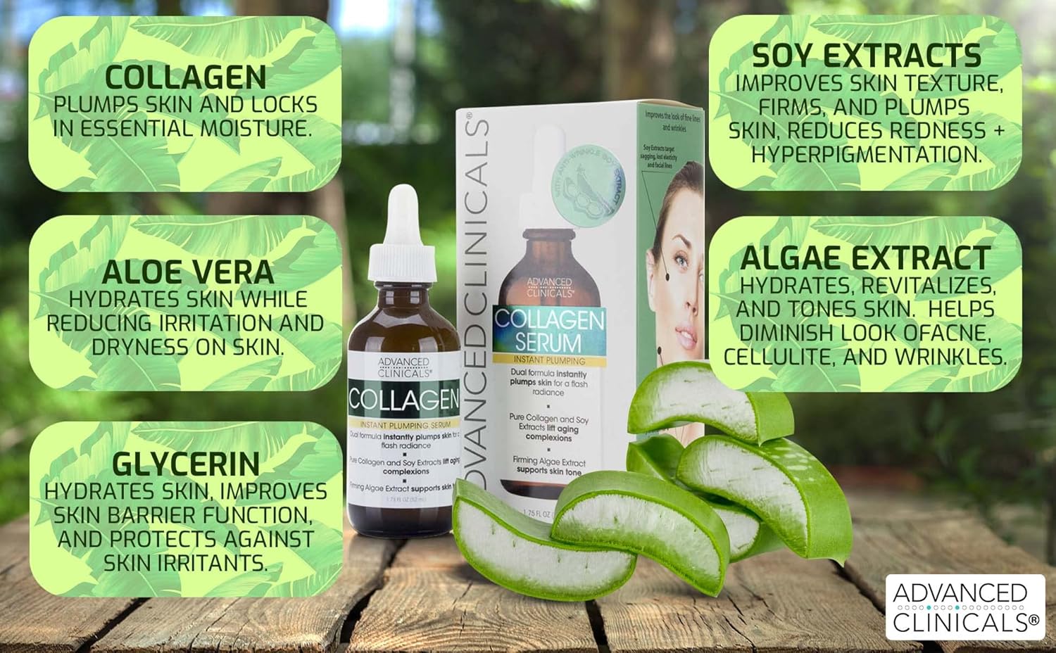 - Advanced Clinicals Plumping collagen serum and turmeric oil for skin make a great antiaging skin care set. Highly concentrated Collagen facial serum contains firming algae extract to support supple skin. Soy Extracts target sagging, lost elasticity and facial lines. Results within 4 weeks!