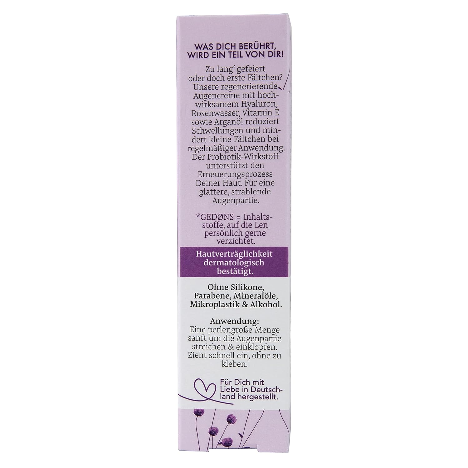 - EYE CREAM: Too much partying or seeing your first wrinkles? Our regenerating eye cream with highly effective hyaluronic acid, rose water, vitamin E and argan oil reduces puffiness and diminishes small wrinkles with regular use. The probiotic ingredient supports your skin’s renewal process. For a smoother, radiant eye area.
