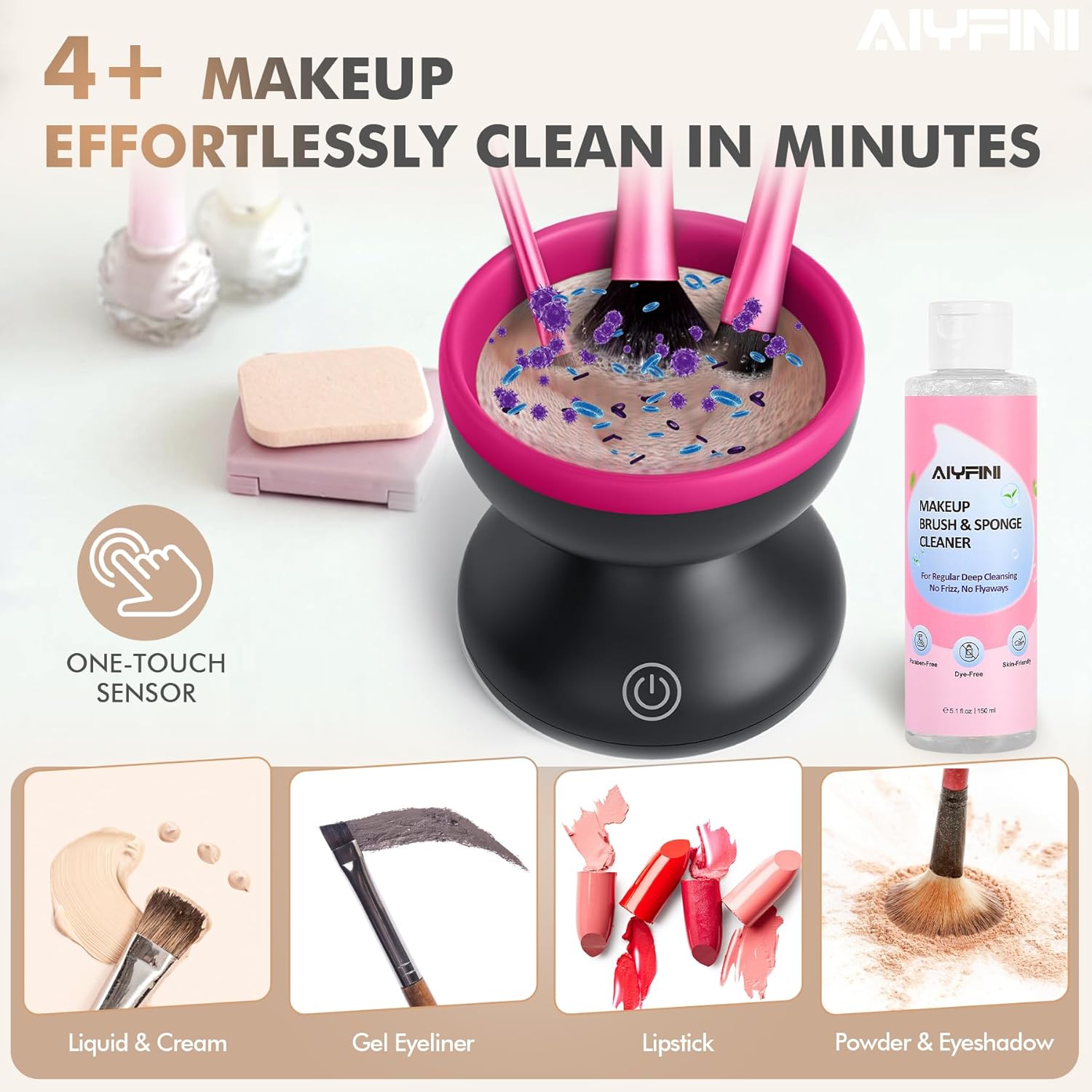 - Effortless Cleaning: The electric makeup brush cleaner can be used to clean almost all types of cosmetic products, such as cream-based makeup, liquid foundation or blush, powder, and eyeliner. The silicone brush cleaner bowl is compatible with all types of make up brushes sets, such as Kabuki brush, foundation brush, contour brush, concealer brush, and eyeshadow brush