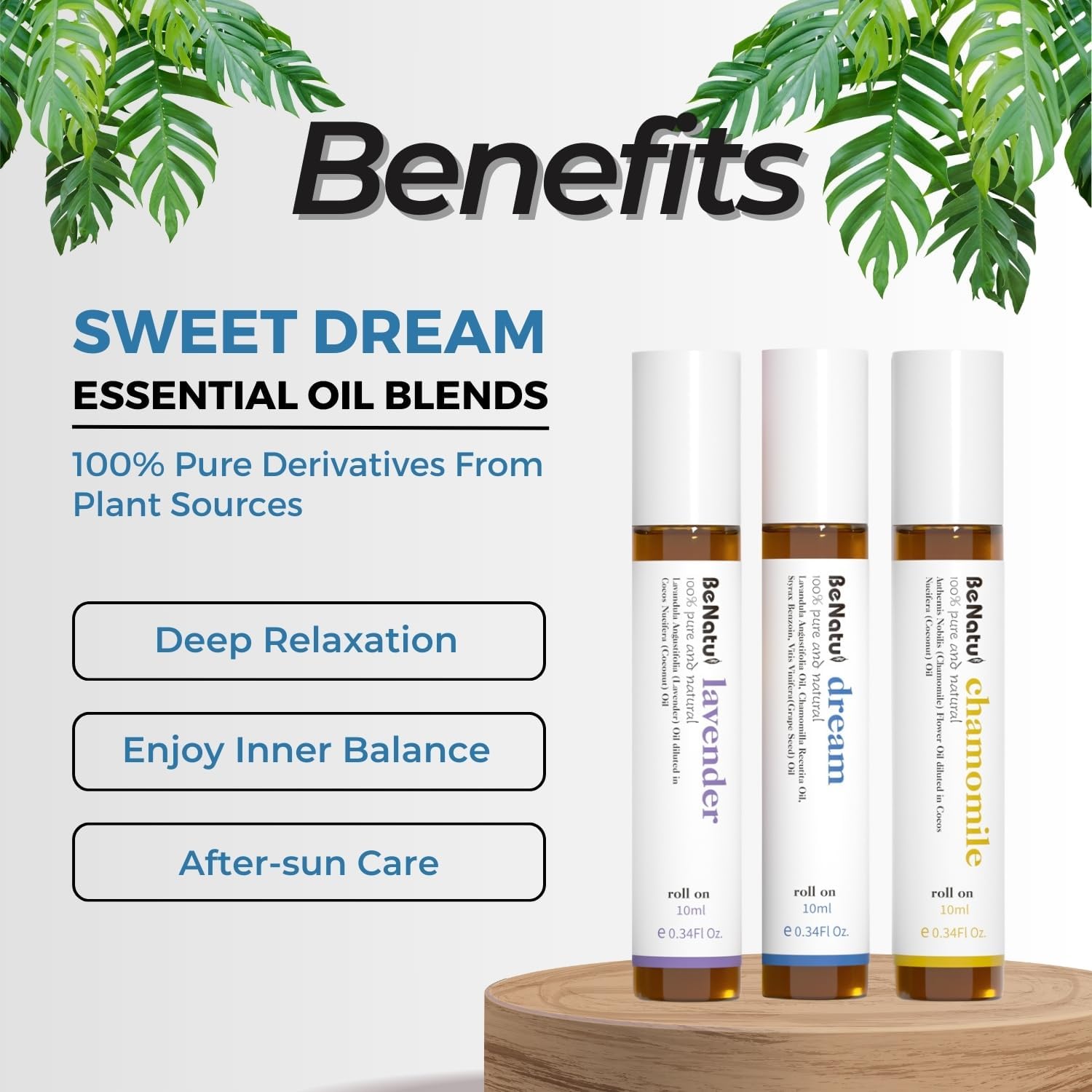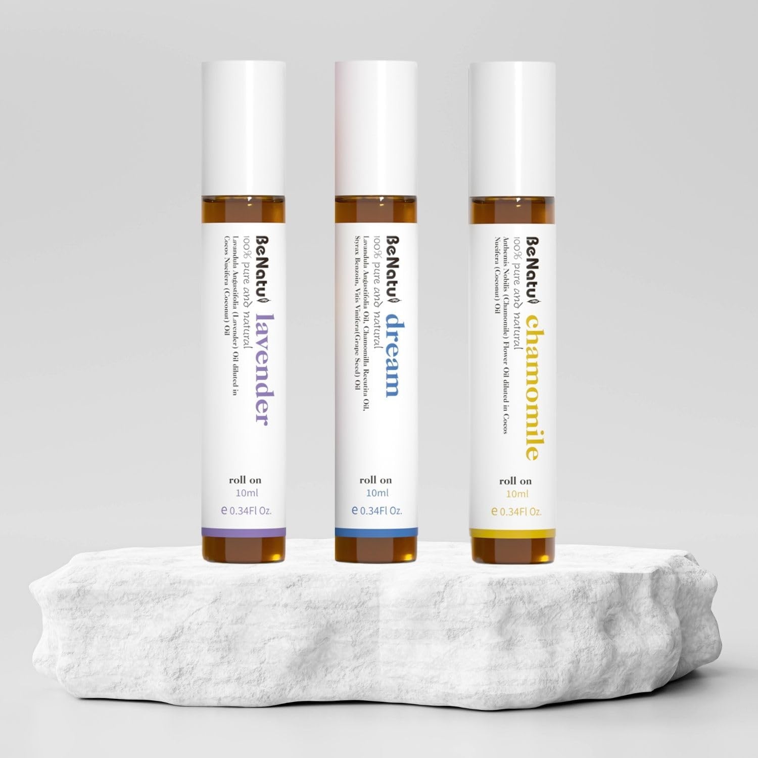 Benatu Essential Oil Roll On Set (Dream, Lavender, Chamomile), Aromatherapy Roller for Massage, Body Skin Care, Home - Natural Fragrance Gift for Women and Men