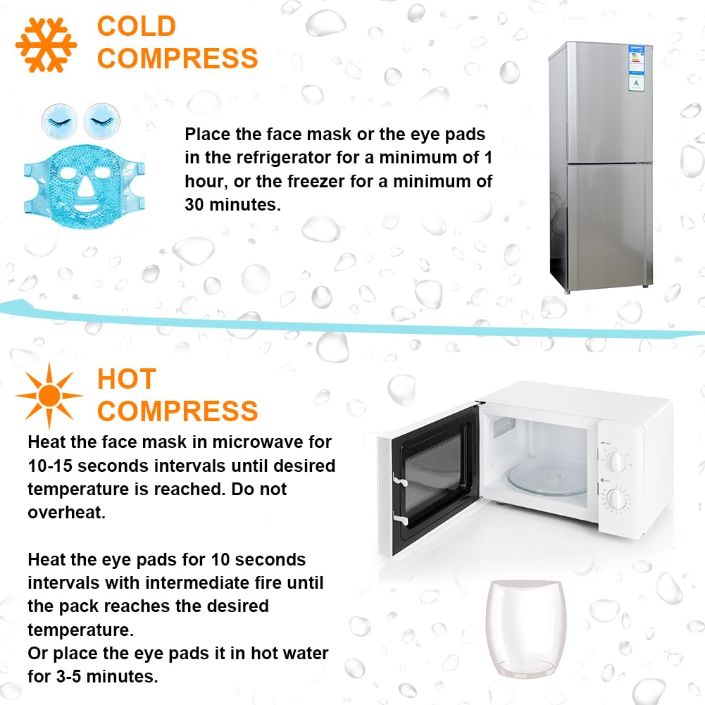 - ăConvenient to UseăSimply store the cooling eye masks in the freezer at -18â or lower temperature for at least 2 hours. For better effect,the best freezing time is 2-6 hours.heat the cooling face mask in microwave in 10-15 seconds intervals until desired temperature is achieved,the maximum heating time does not exceed 30 seconds.