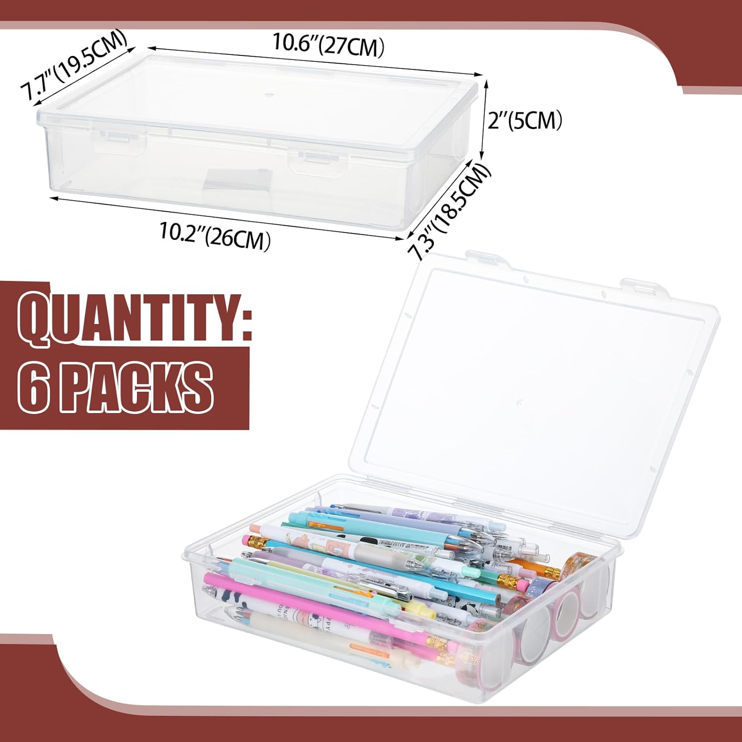 Qunclay 6 Pcs 10.6'' x 7.7'' x 2'' Plastic Storage Box with Lid Multipurpose Craft Organizers Plastic Containers Clear Pencil Case Art Satchel Storage Case for Beads Ornaments Crafts Accessories