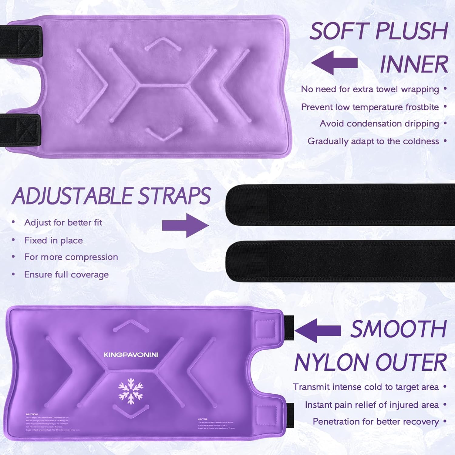 - 2 Levels Cold Therapy Effects: The plush side is soft to skin, which transmits soothing coldness to avoid condensation and frostbite without extra towel wrapping; The silky nylon side provides stronger coldness for quickly effective pain relief. It is recommended to use the plush side in the first few minutes to help the skin gradually adapt to the cold.