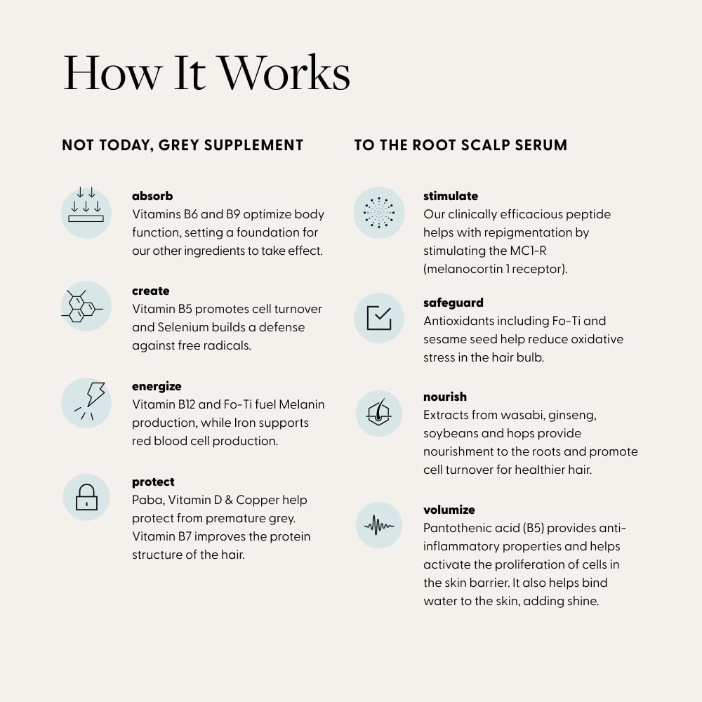 - AID REPIGMENTATION IN EARLY GREY STAGES IN 3-6 MONTHS: The System by Arey tackles grey hair inside-out with Not Today, Grey (daily supplements) and outside-in with To The Root (a clean, oil-free, scent-free serum).
