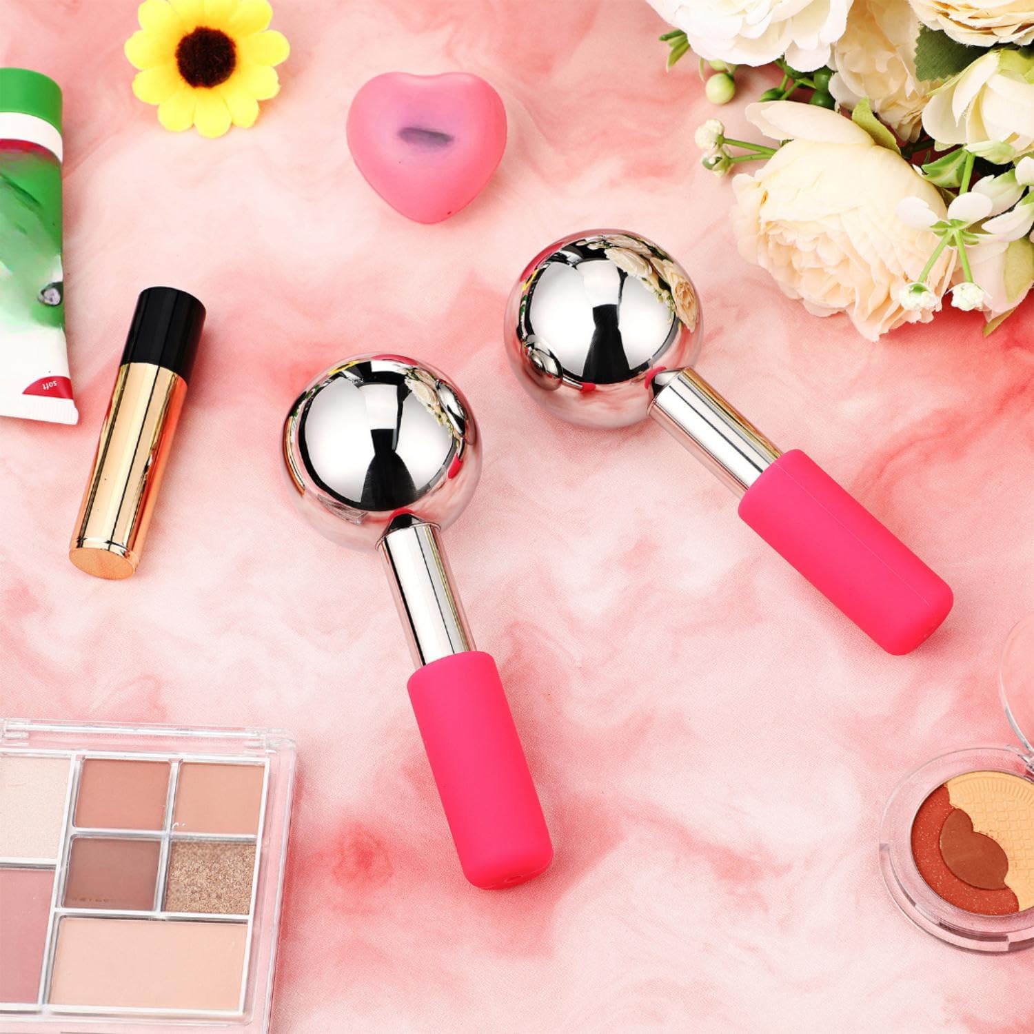 Baderke 2 Pcs Ice Globes for Face Stainless Steel Cooling Globes Unbreakable Cooling Roller Women Ice Balls Cryo Sticks Face Skin Care for Dark Circles, Puffiness(Silver (pink Handle))