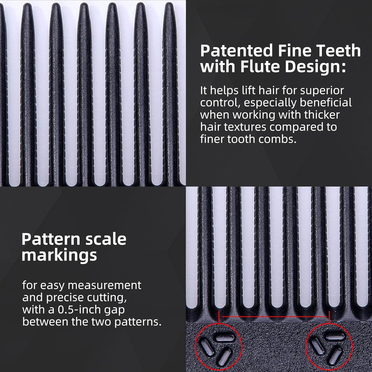 - Superior Hair Lift and Control: The unique flute design of the teeth provides better hair lift and superior control. This feature is especially beneficial when working with thicker hair textures, giving these combs a competitive edge over conventional fine tooth combs.