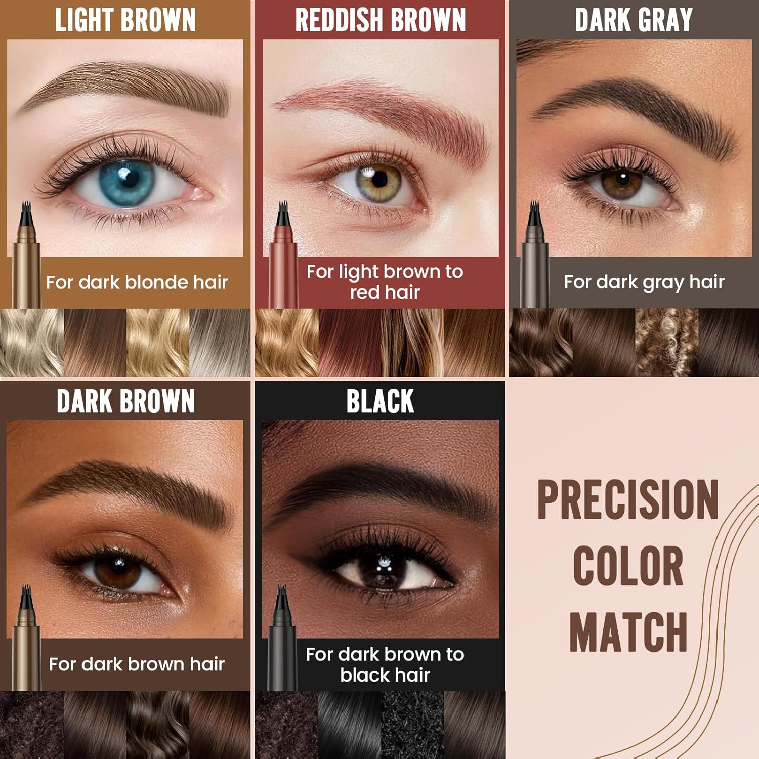- 【5 Classic Precision Color】With a diverse range of shades including Dark Brown, Light Brown, Black, Reddish Brown and Grayish Brown, our eyebrow contouring pen offers a precision color match for every skin tone and makeup style. Whether you're aiming for a subtle enhancement or a striking accent, find your perfect hue and bring out your unique flair with every stroke.