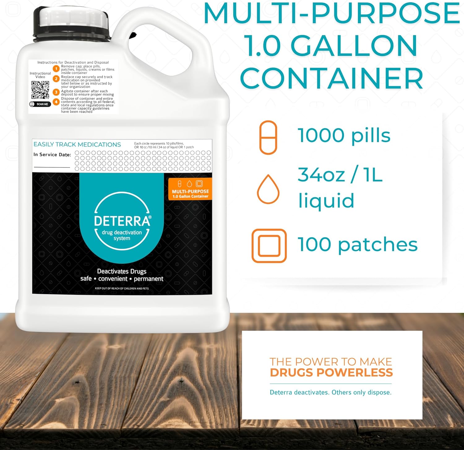 - Effective: The ONLY drug deactivation container scientifically proven to work. The drug deactivation container provides a safe, convenient and permanent disposal of unused, expired or unwanted medications at home or in a clinical setting. Each container will deactivate and dispose of up to 1,000 pills, 34oz/1L or 100 patches at a time.