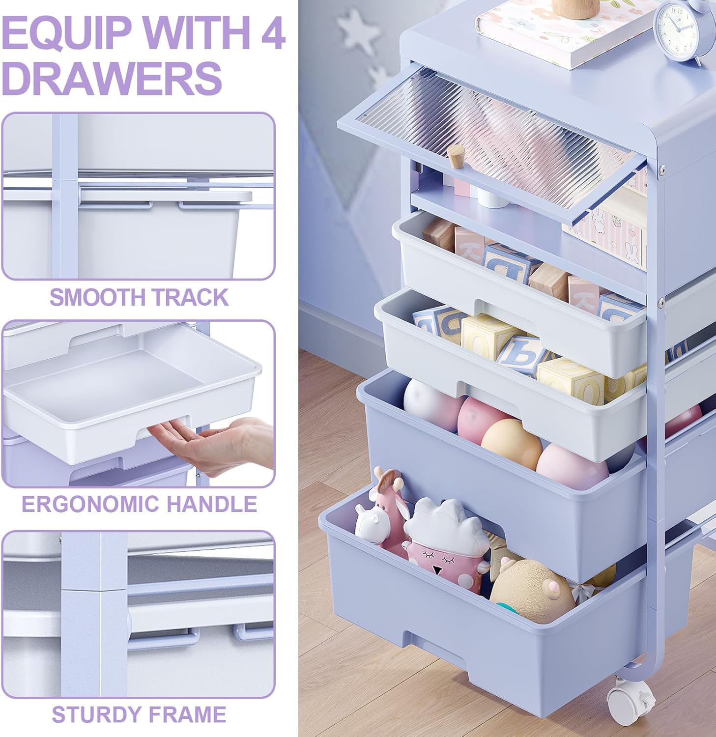Utility-Rolling-Storage-Drawer-Craft-Cart-Organizers with 4 Drawers & Dust-Proof Door for Kid Craft Art Room,Bedroom,Home Office, Lavender Purple