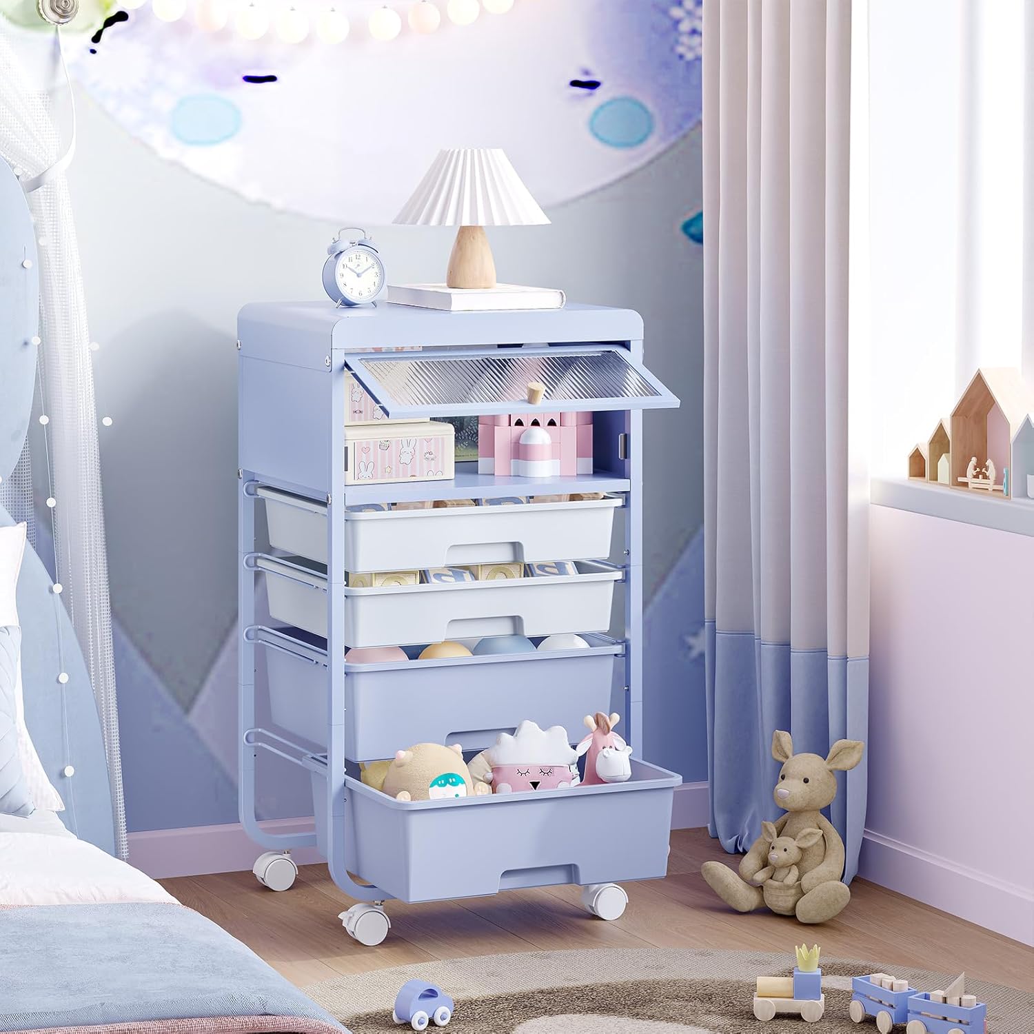 - VERSATILE USE & SAFETY: Perfect as a nightstand in kids' rooms or a toy storage drawer cart in play corners. It pairs beautifully with kid's beds, play tents, and room decals, offering ideal storage for scattered toys, storybooks, crayons, and markers. The rounded edges on the rolling cart drawers prevent bumps during playtime, creating both a stylish and safe space for your kid.