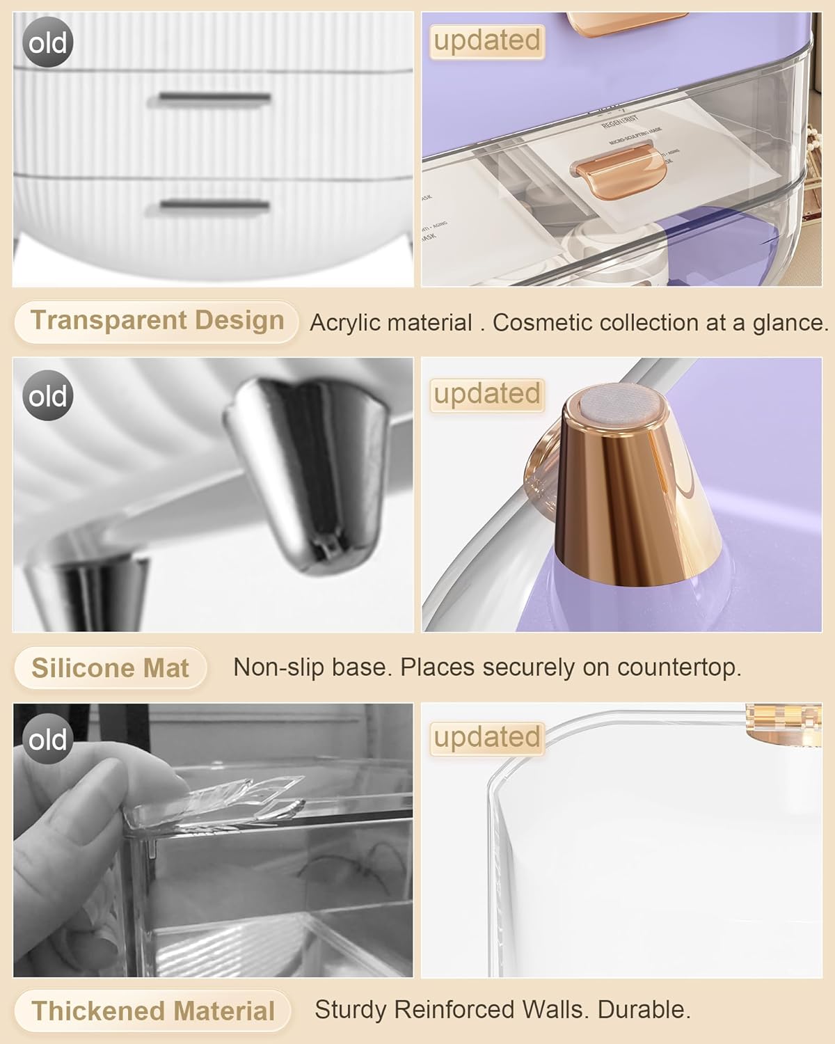- 🎁【Thickened Material & Non-slip】Reinforced and upgraded handle won't fall off. Easily move the skin care organizer to anywhere. The countertop organizer is made of thickened ABS material, which is stronger and more durable than normal ones. Drawer and clear top are able to open and close easily. Rubberized bottom, non-slip and won't scratch desktop.