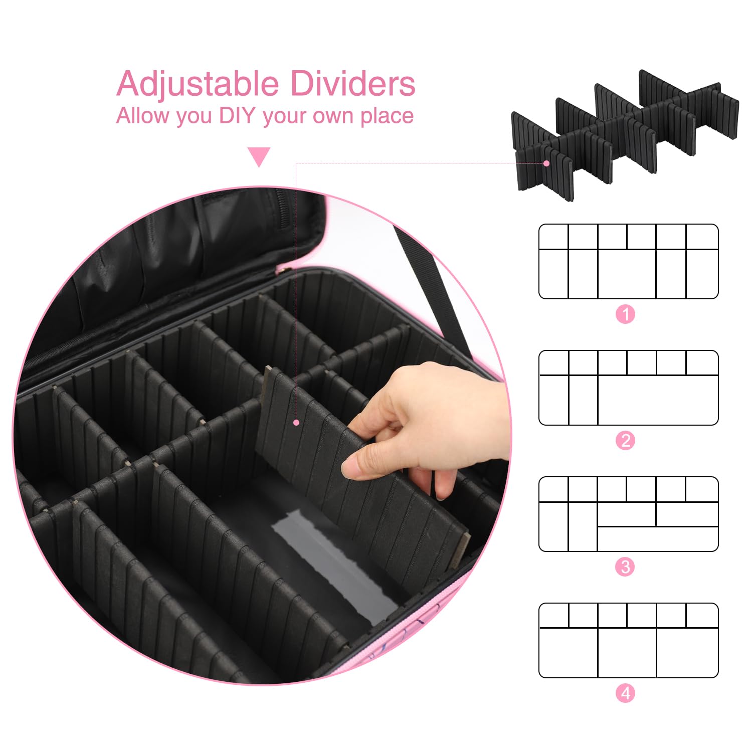 - DIY Your Own Train Case Space: Come with 10 EVA dividers( one long,four medium,five short ),you can design the internal compartments by the adjustable padded dividers.