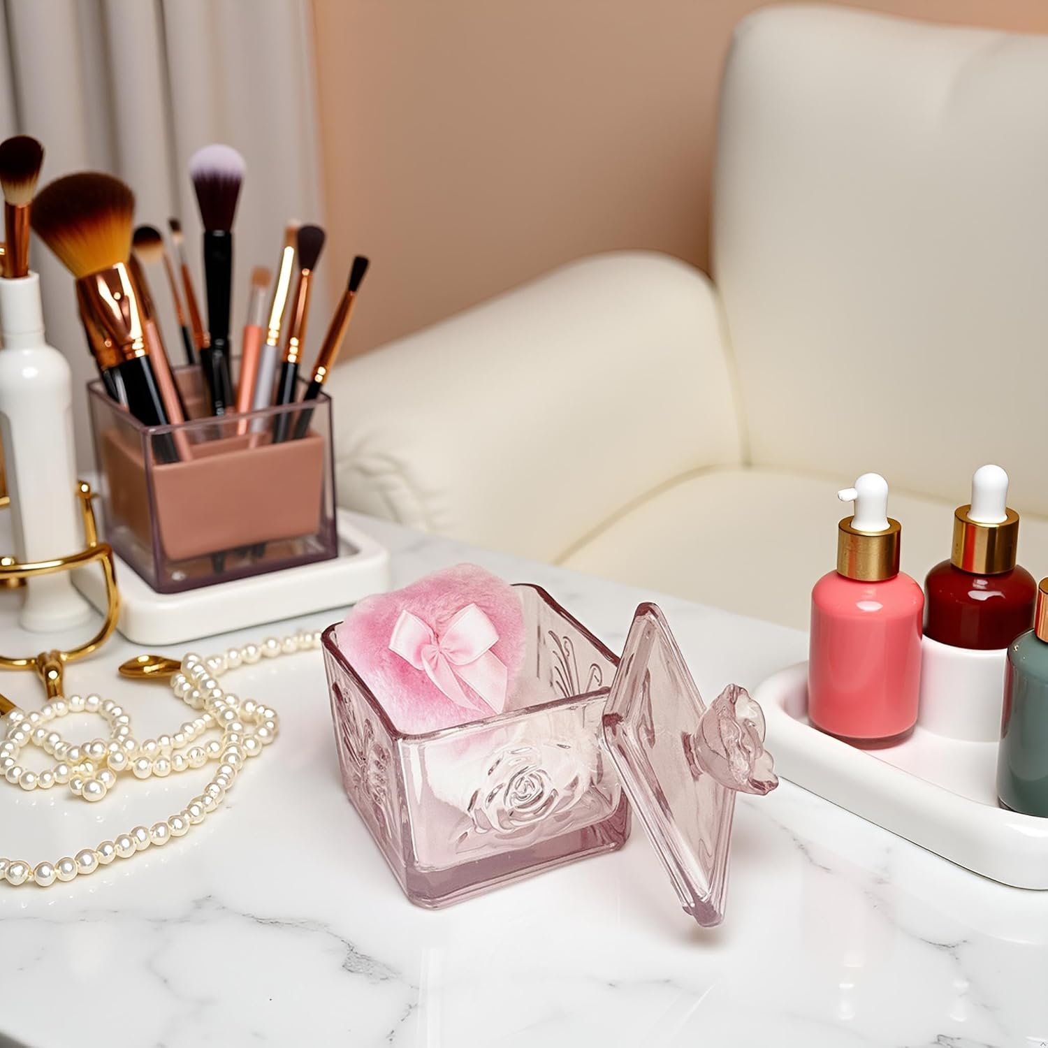 - 【Multi-Purpose Glass Box】This glass powder puff case can not only be used to store powder puffs, but also can be used to store earrings, rings, bracelets, hair accessories, knick-knacks, as well as other items in the dresser, bathroom and bedroom. It keeps your items away from dust and water, protects and decorates, and meets the needs of female users for cosmetic organization