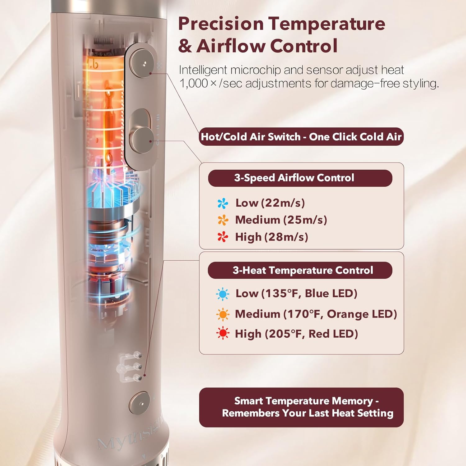 - 3 Heat / 3 Speed + One-Touch Cool Shot — 3-Heat temperature control: low 135°F (Blue LED), medium 170°F (Orange LED), high 205°F (Red LED). 3-Speed airflow control: Low / Medium / High. Dial in the perfect combo for your hair type, then press the Cool Shot button once (press-to-toggle; no need to hold) and wait 10s to lock styles with less heat damage.