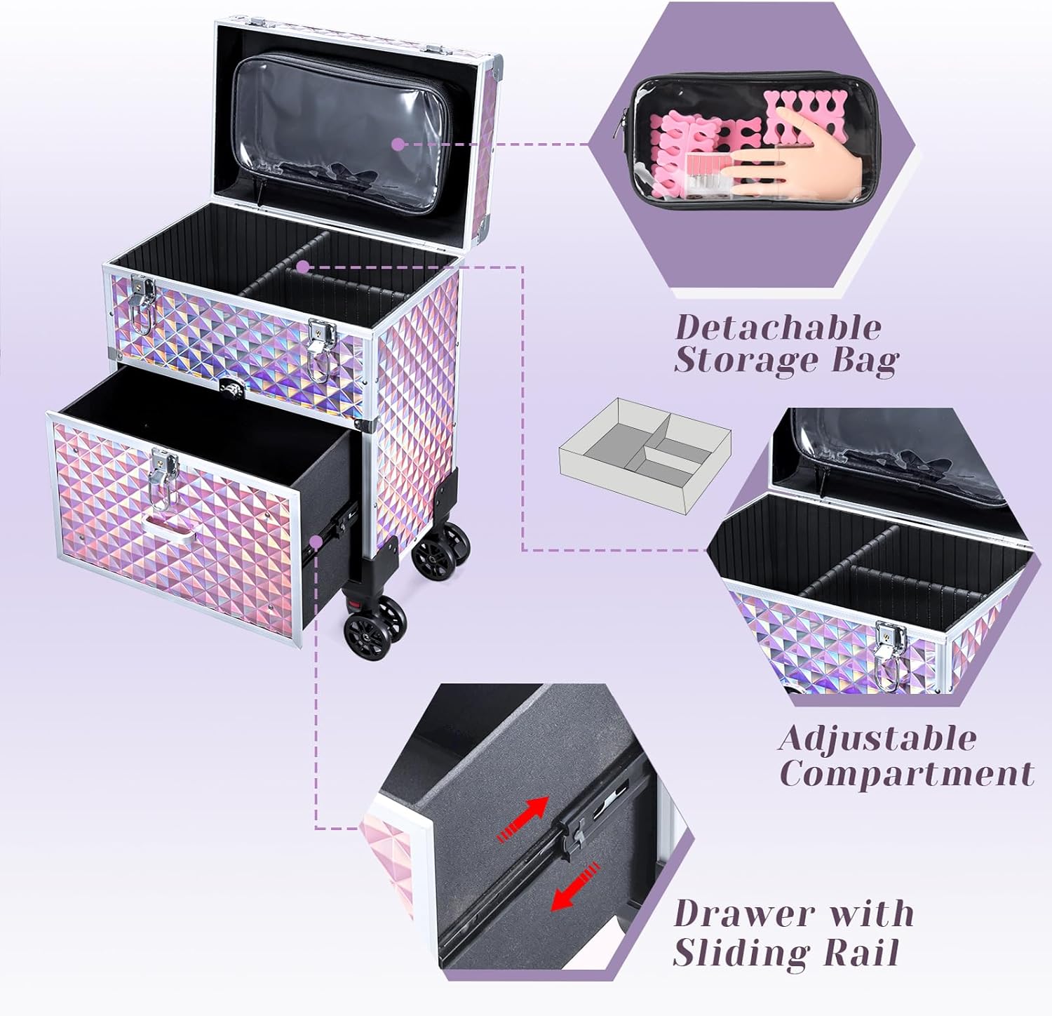 - Multi-Functional Rolling Case - The wheeled rolling makeup case with drawer is designed to meet the needs of professionals such as nail technicians, makeup artists, and hairstylist. It is also coated with pretty diamond stlye finish.