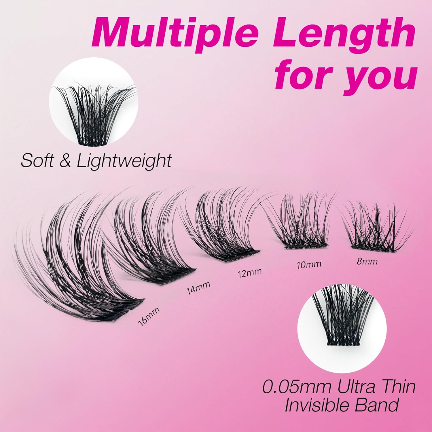 - Invisible band eyelash cluster 8-16mm mix lash tray are handmade with high quality PBT fibers that ensure the lashes are soft, lightweight and comfortable to wear.